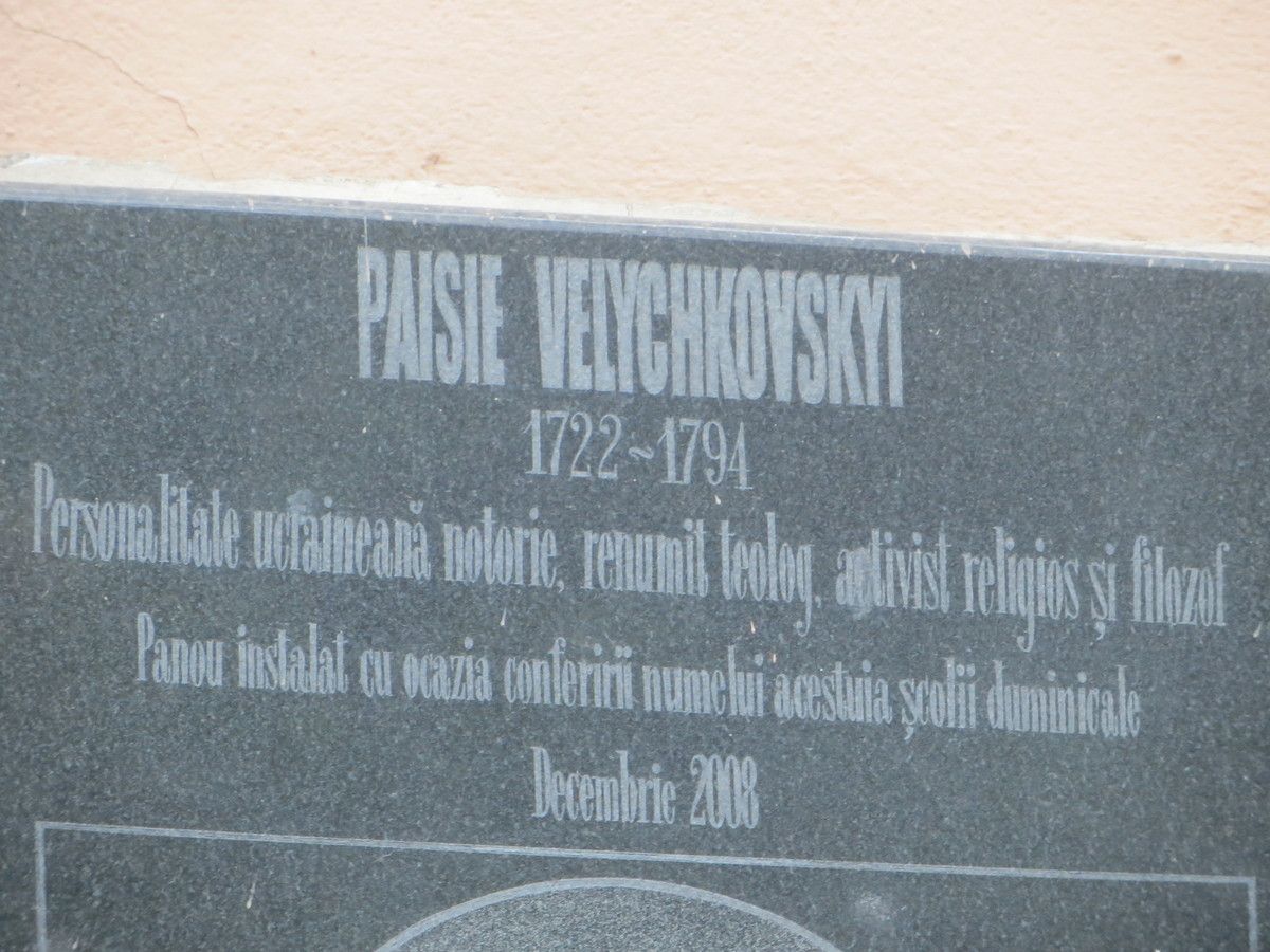 Pentru cei care au instalat această plăcuță comemorativă Paisie Velicikovski este un „activist religios și teolog”... dar mai presus, o „personalitate ucraineană notorie”. Niciodată nu m-am gîndit la originile ucrainene ale cuviosului, deși știu că era născut la Poltava. Desigur, nu putem nega originile nimănui, dar cînd știm cît de legat a fost acesta de mediul sihăstresc al zonei Buzăului, unde l-a avut ca povățuitor pe nimeni altul decât pe starețul Vasile de la Poiana Mărului, și la faptul că a petrecut circa 4 ani în Țara Românească - amănuntele familiale devin aproape caduce. Nu mai vorbim aici de lunga tradiție de la Secu și Neamț, unde Paisie, revenit cu o comunitate din Sfîntul Munte, a dat noi sensuri trăirii duvovnicești, activității editoriale și poligrafice.